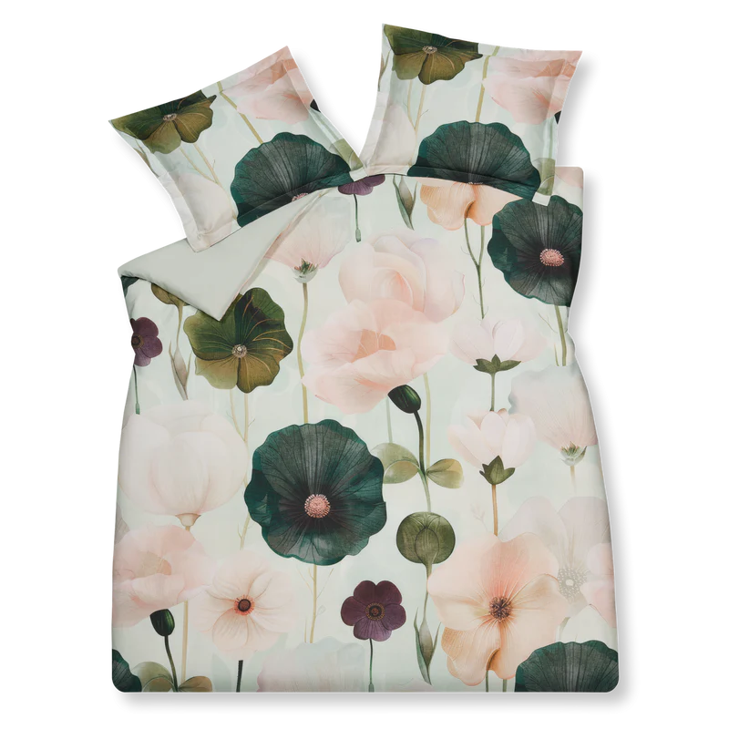 Dekbedovertrekset Finesse in de kleur pistache combineert grote roze klaprozen met groene accenten op glad katoensatijn. Alleen de voorzijde is bedrukt, met een effen achterzijde en een kussensloop met oxford rand. Krachtig en verfijnd. Dit 100% katoensatijnen dekbedovertrek biedt een luxueuze en comfortabele slaapervaring dankzij de zachte, soepele textuur en ademende eigenschappen. Het speciale weefsel van fijne katoengaren zorgt voor een glad oppervlak en lichte glans. Hierdoor voelt het heerlijk zacht op de huid, wat zorgt voor comfortabel slapen. Bovendien reguleert katoen van nature de lichaamstemperatuur en absorbeert het vocht, wat resulteert in een aangenaam slaapklimaat en goede nachtrust.